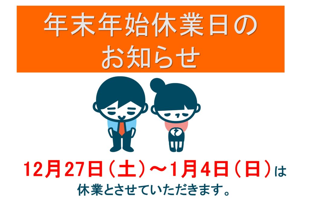 2025.12.26 ★年末年始休業のお知らせ★ 2025年もあと少しになりましたね。今年もお世話になりました。 年末年始は2025年12月27日(土)から2026年1月4日(日)まで休業いたします。 休業期間中にいただいた「メール相談」や「お問合わせ」等については、1月5日(月)以降順次、対応いたします。あらかじめご了承ください。 2026年もどうぞよろしくお願いいたします。 この記事をシェアする シェア Tweet