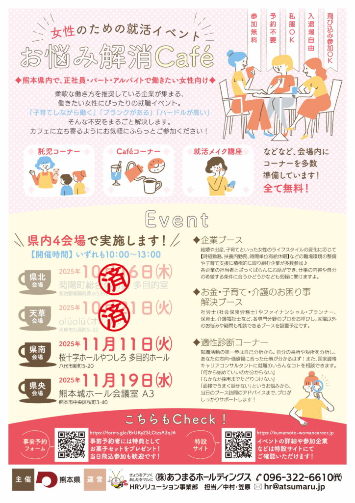 熊本県主催の女性のための就活イベント「お悩み解消Café」が開催されます。